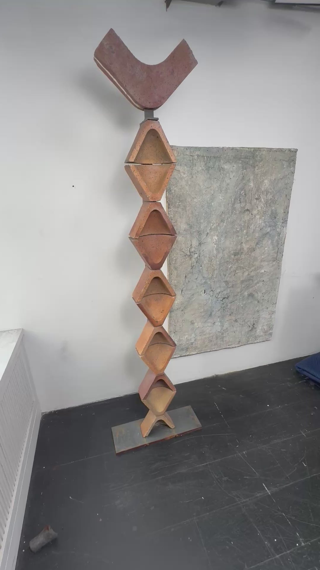 pair of monumental French 1970s earthenware and steel totems purchased from an estate in the south of France.