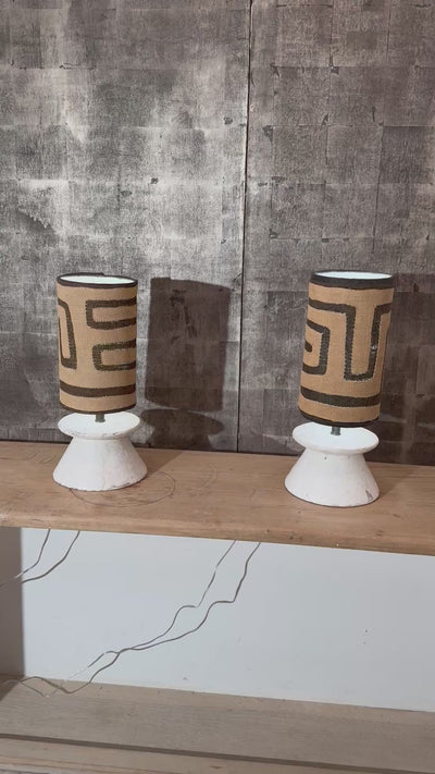 pair vintage French 1950s wood and plaster lamps please note plaster has flaked in places but an adhesive has been applied to solidify plaster so the surface will not flake or chip. Please also note that one lamp is 1 inch higher than the other. one lamp is 17 inches tall and the other is 18 inches tall. These are newly wired with new kuba cloth shades.